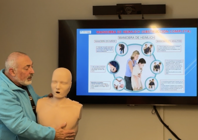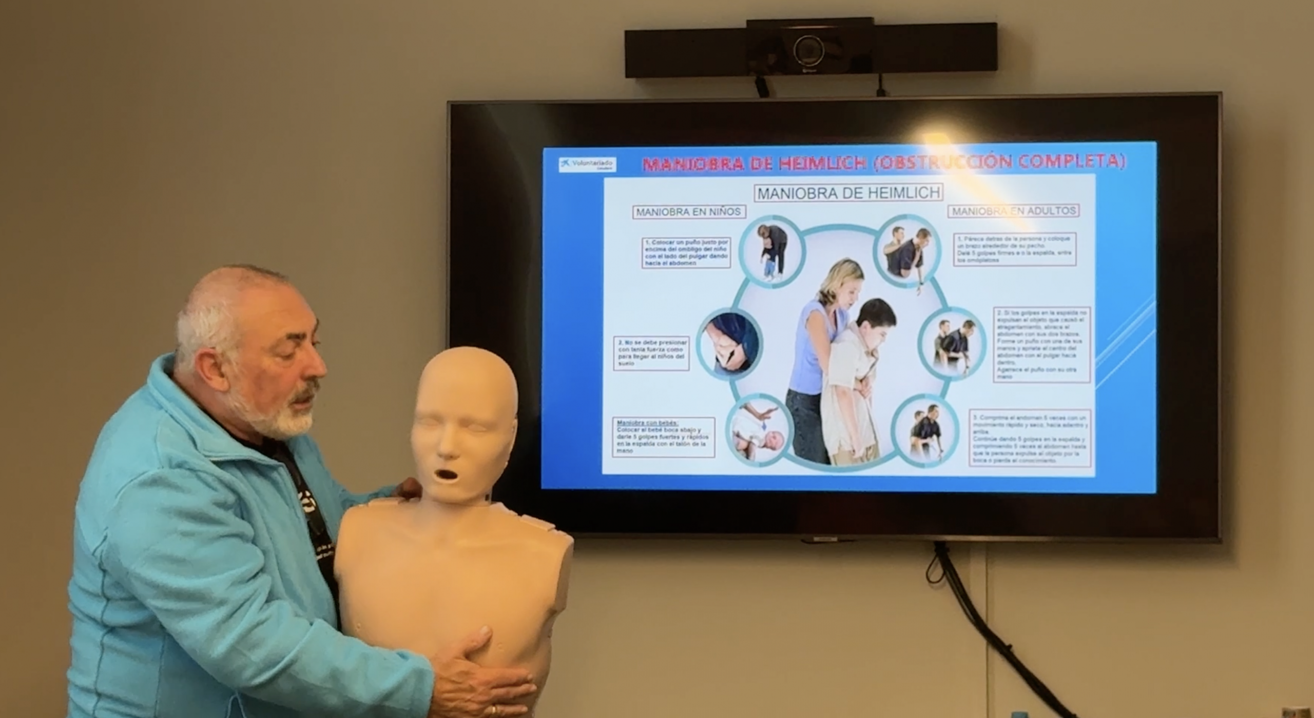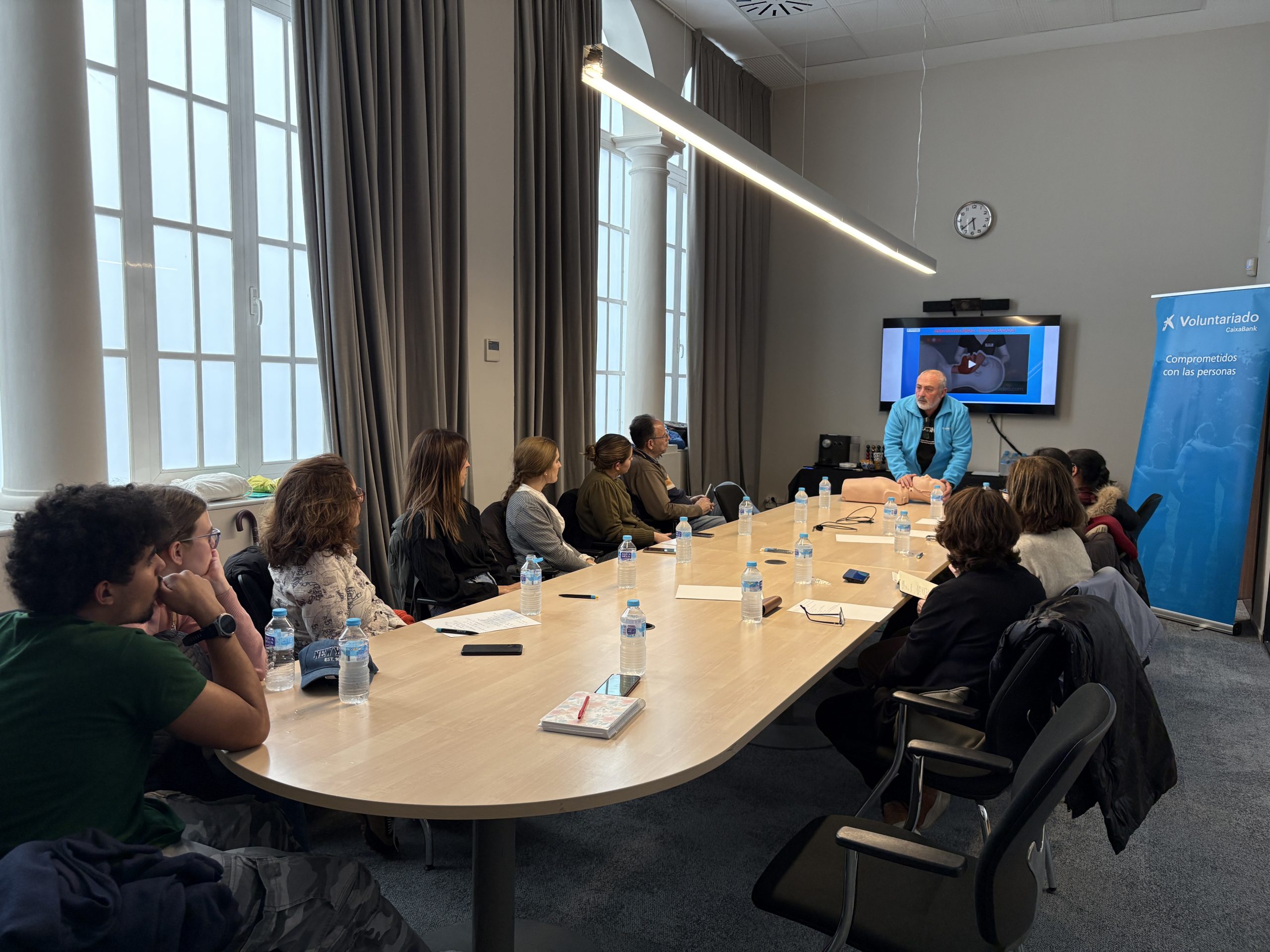 De la mano de Juan, experto en emergencias del Voluntariado CaixaBank, el taller abordó de manera sencilla los contenidos esenciales para hacer frente de forma efectiva a situaciones de emergencia en contextos cotidianos. Los asistentes profundizaron en la vital conducta PAS (Proteger, Alertar y Socorrer) y analizaron la cadena de supervivencia. La sesión teórica permitió asentar conocimientos sobre cómo identificar y reaccionar ante situaciones críticas como hemorragias, quemaduras, heridas o atragantamientos (OVACE), herramientas indispensables para quienes trabajan diariamente con colectivos vulnerables.