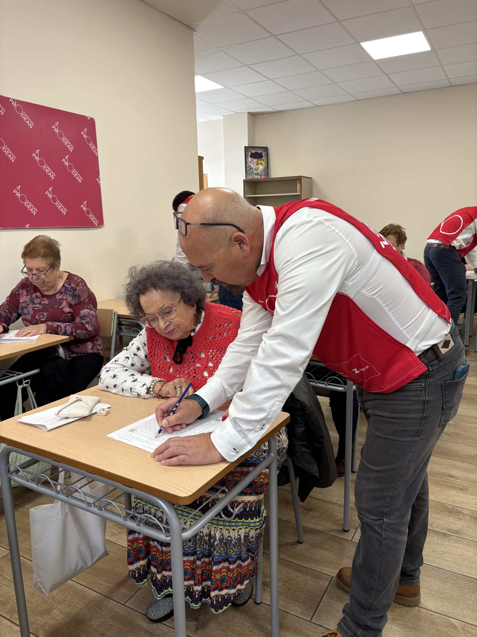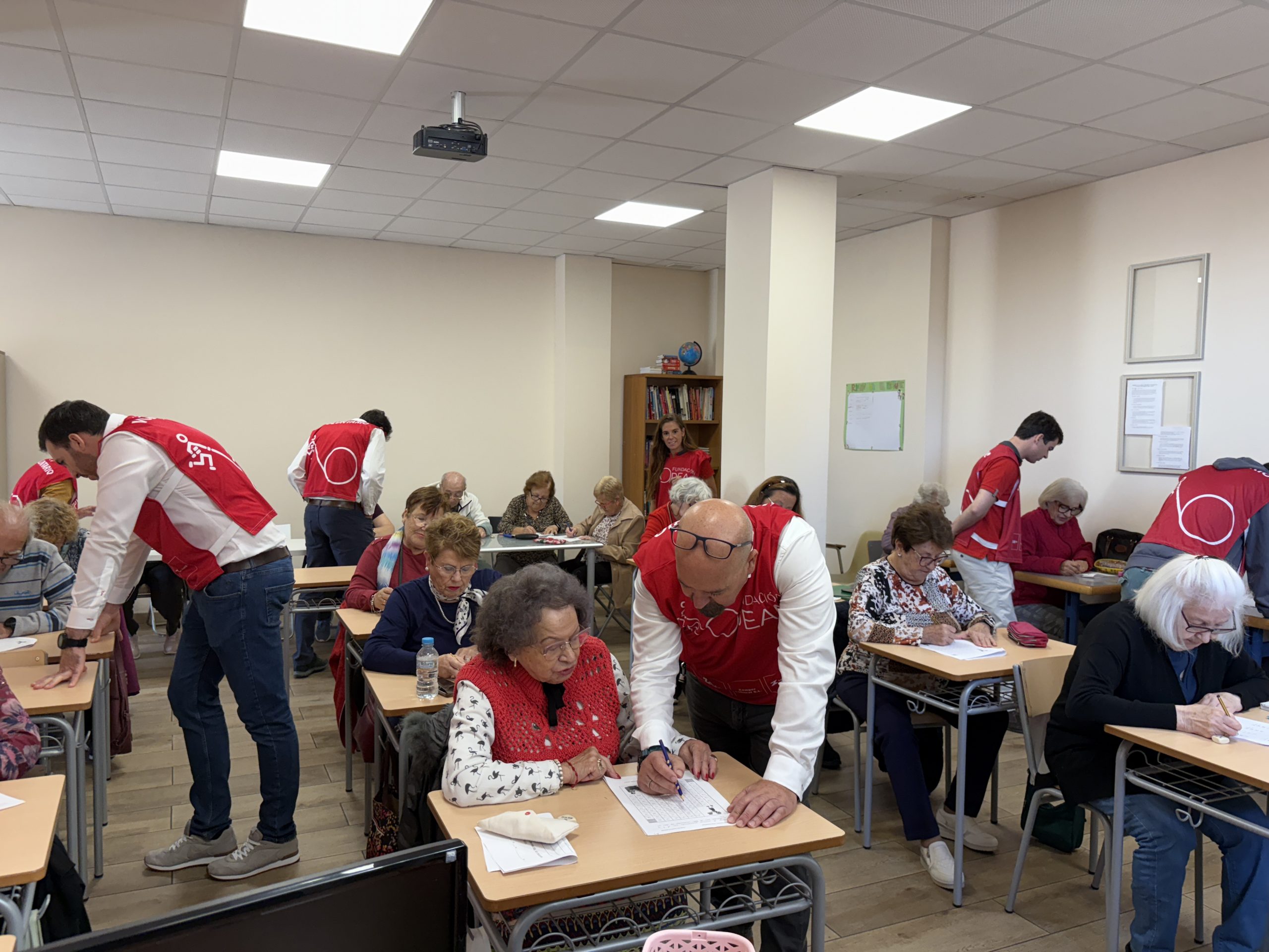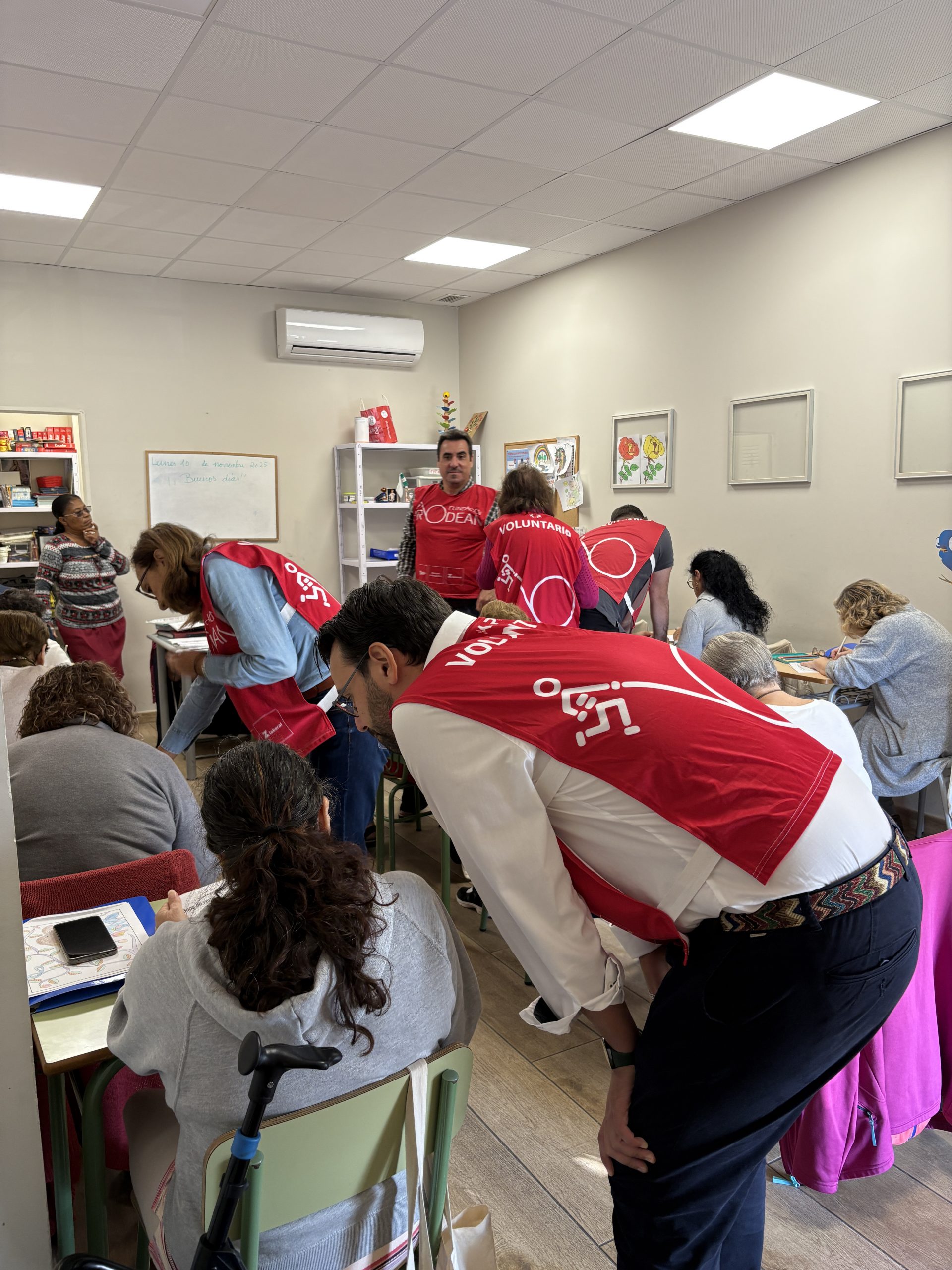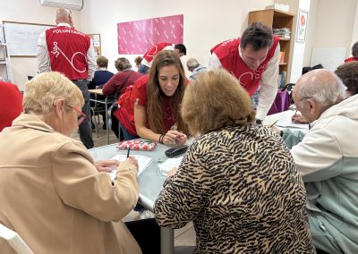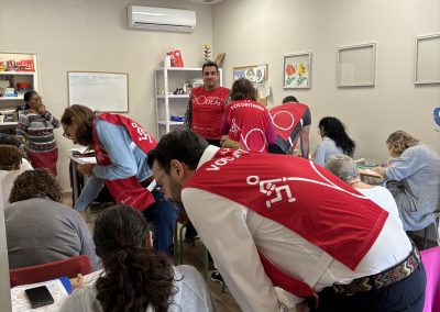 Tras la presentación, los voluntarios de Hilti se integraron activamente en el día a día del centro, participando en el popular taller de memoria y alfabetización. Este taller se lleva a cabo de lunes a viernes y reúne habitualmente a alrededor de 45 personas mayores del barrio, siendo un espacio vital para su estimulación cognitiva y social. La presencia de los empleados de Hilti aportó una energía fresca y dinámica, asistiendo a los participantes en sus ejercicios y fomentando la interacción.
