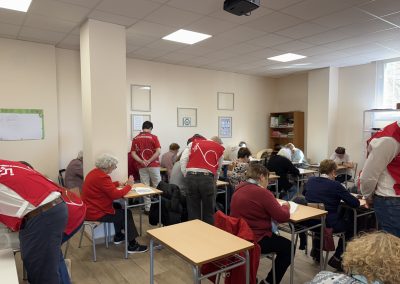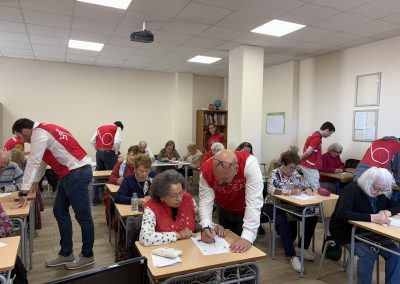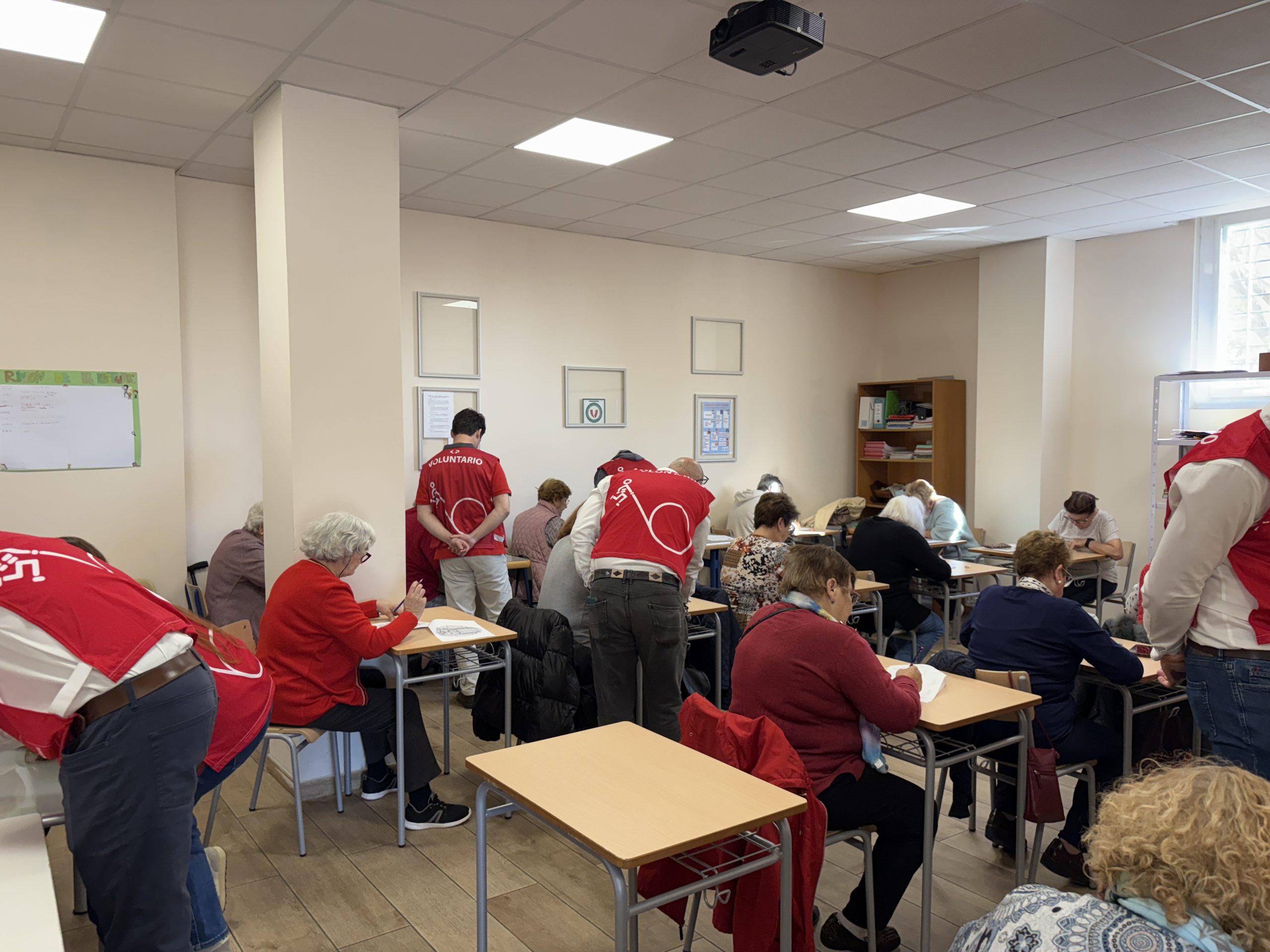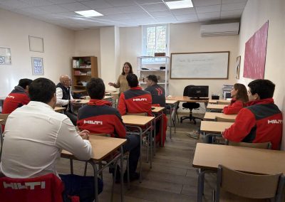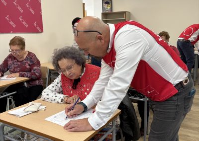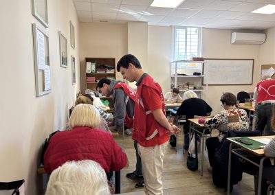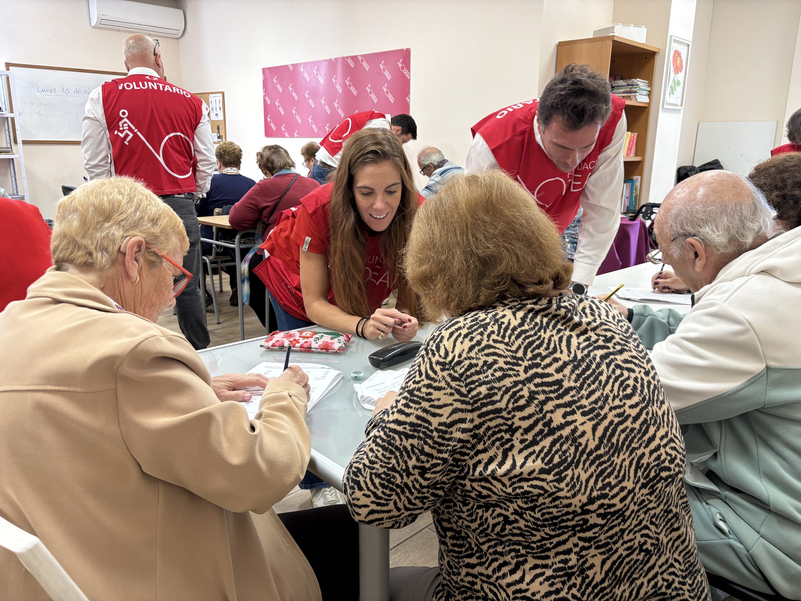 Tras la presentación, los voluntarios de Hilti se integraron activamente en el día a día del centro, participando en el popular taller de memoria y alfabetización. Este taller se lleva a cabo de lunes a viernes y reúne habitualmente a alrededor de 45 personas mayores del barrio, siendo un espacio vital para su estimulación cognitiva y social. La presencia de los empleados de Hilti aportó una energía fresca y dinámica, asistiendo a los participantes en sus ejercicios y fomentando la interacción.